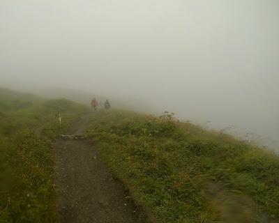 Col Feret was the Swiss border. The path soon became steep and winding, as the clouds gathered and the rain started. Soon we were surrounded by mist, and being washed with rain. Jackets came out of back packs, hats and fleeces were hurried on. I opted for just my OMM jacket on top of the shirt I'd be running in all day, I was pretty hot with the climbing despite the rain and wind. As we went higher, the weather got grim and I started to feel pretty awful. Weakness and fatigue in ultra running is pretty much always nutrition related. Its amazing what your body can put up with in pure endurance terms, but it hates running on empty. I recognised the signs - slightly trembling hands, a feeling of slight sickness and a profound tiredness as if 'flu was on the way. I slowed down, chewed a couple of glucose tablets, and took a few photos through the rain. It was a tortuous end to the climb, but eventually wind strength increased heralding my arrival at the col, and a group of fluorescent clad figures next to a dome tent appeared. The nearest figure with a UTMB Medic badge on his jacket came to scan my bib, looking me full in the eye as he did - a look I saw him give to every runner arriving at the col as he checked for impending hypothermia and exhaustion.